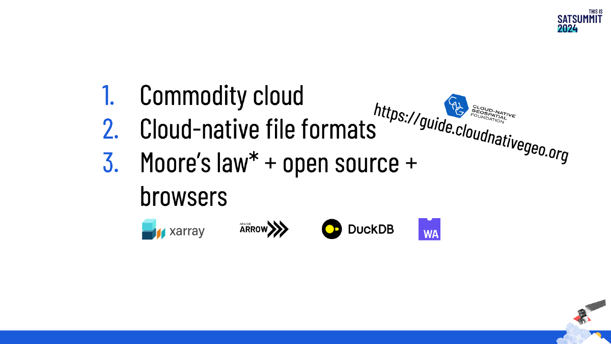 - Along the same lines, we now have nonproprietary highly efficient file formats that take advantage of the cloud. One of our main initiatives at Radiant Earth is the Cloud-Native Geospatial Foundation which aims to help more people benefit from this fact. Please go check out guide.cloudnativegeo.org which was produced by our beloved friends at Development Seed and NASA to get an idea of what’s possible. If you want to make data available, you can get very far today by simply putting files and metadata into the cloud.