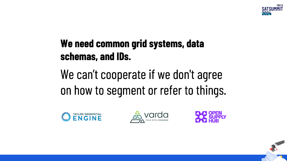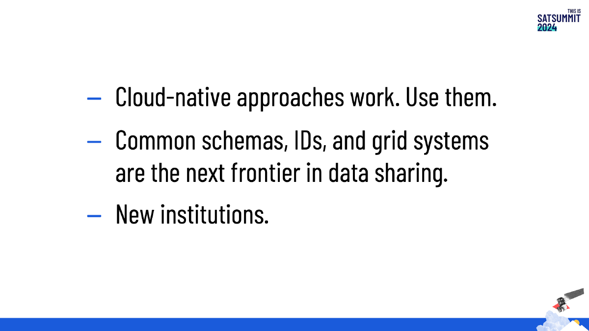 Second, even if we make the cloud easy, we have a lot of work to do to make data more interoperable. We’re confident that more earth observing satellites are going to keep coming, but we still don’t have widespread agreement on which discrete global grid systems we should all use.